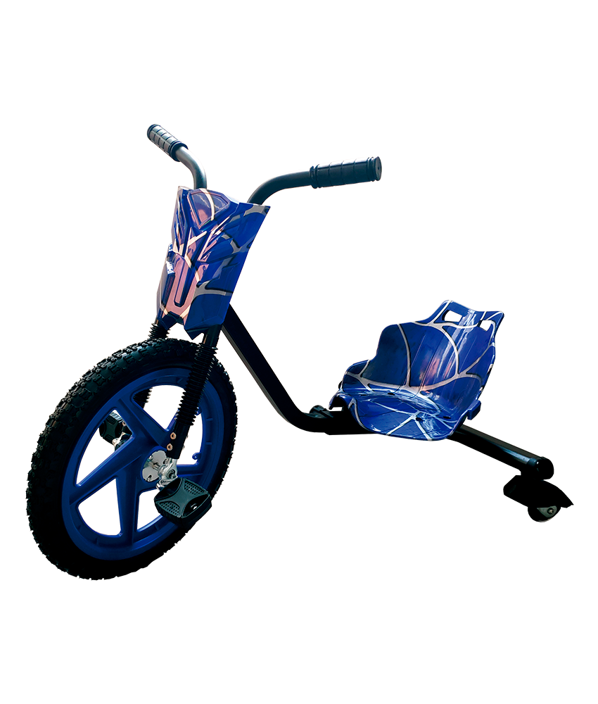 Ele tem um rodão na frente e duas rodinhas pequenas soltas atrás. E você senta quase no chão como se fosse um piloto de corrida.