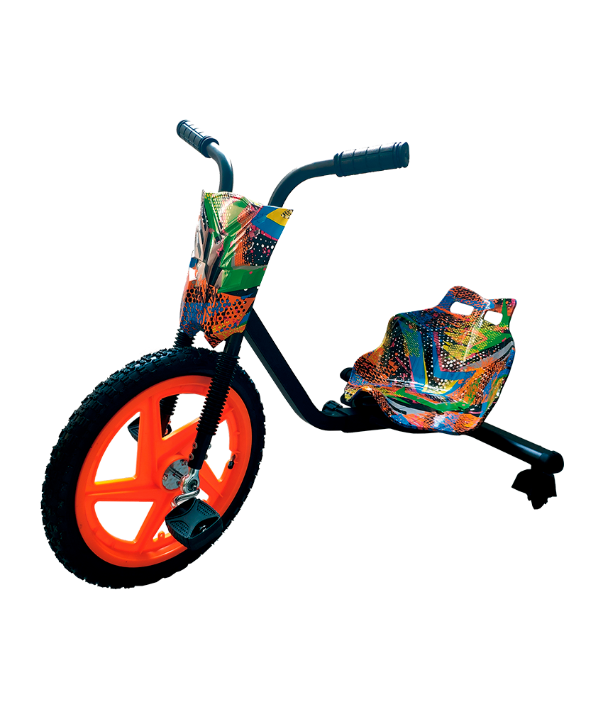 Ele tem um rodão na frente e duas rodinhas pequenas soltas atrás. E você senta quase no chão como se fosse um piloto de corrida.
